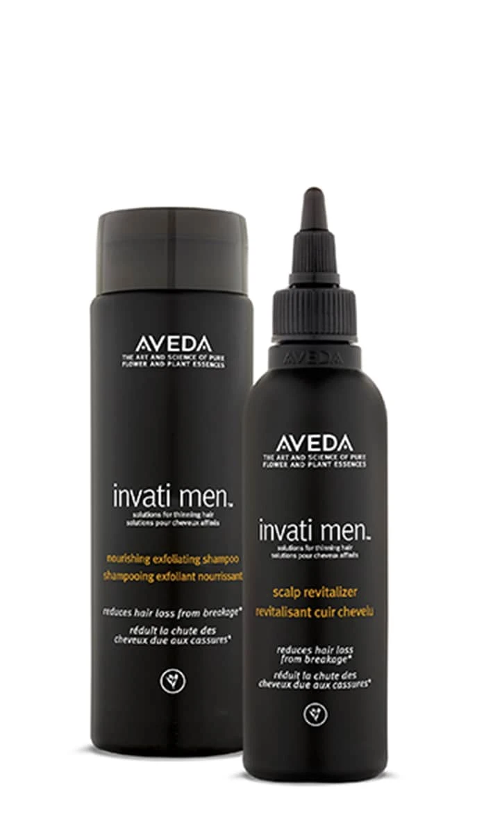 Invati men™ solutions for thinning hair. Reduce hair loss* with 98% naturally derived** invati men™—4 out of 5 men say their hair feels stronger and looks thicker.^ For best results, use the 2-step system:
