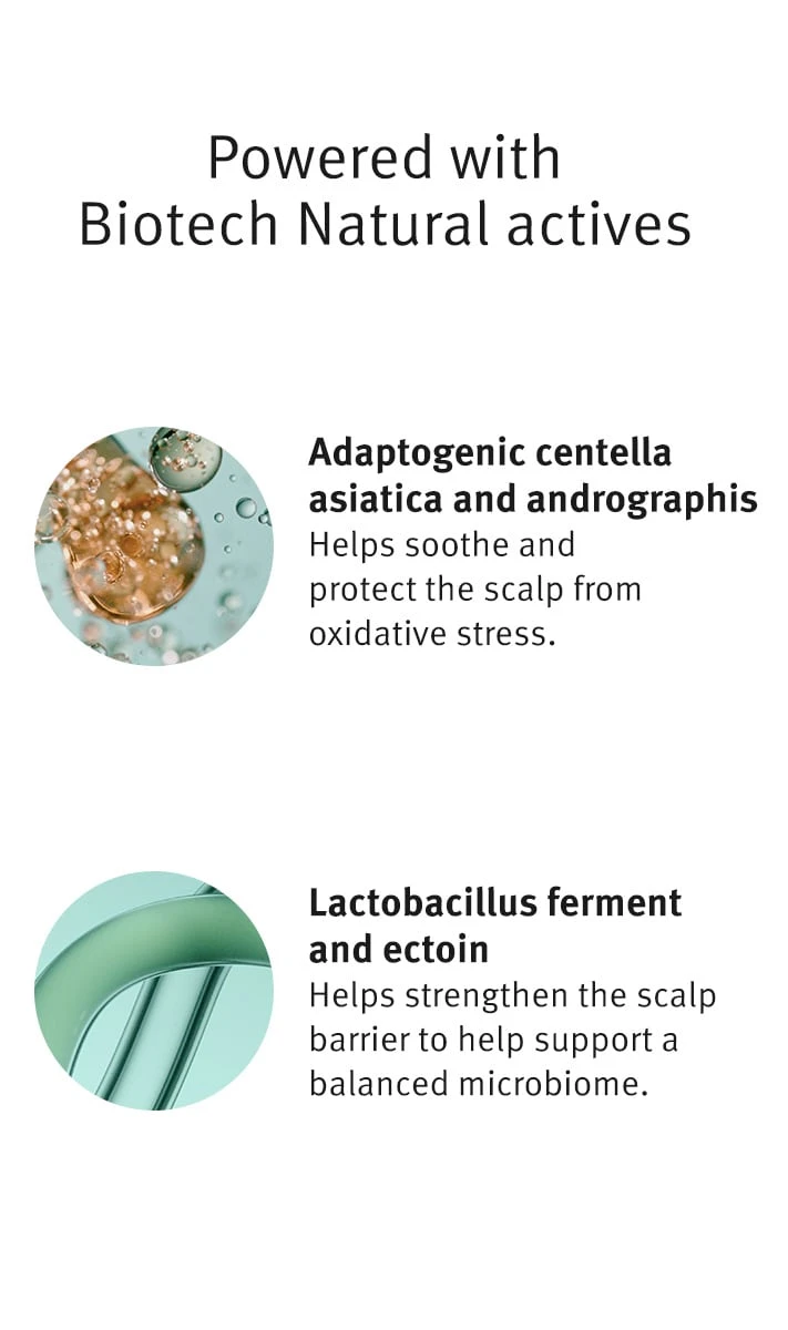 A blend of adaptogenic botanicals, Centella Asiatica and Andrographis, combined with Vitamin E, Resveratrol and Rosemary and Ginger Extracts help protect and shield the scalp from pollution, oxidative stressors and environmental aggressors.